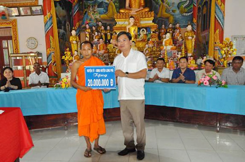 Đồng chí Lâm Tiến Thạch - Bí thư Huyện ủy Long Phú tặng 20 triệu đồng cho đội ghe Ngo chùa Bâng Cro Chắp Thmây.