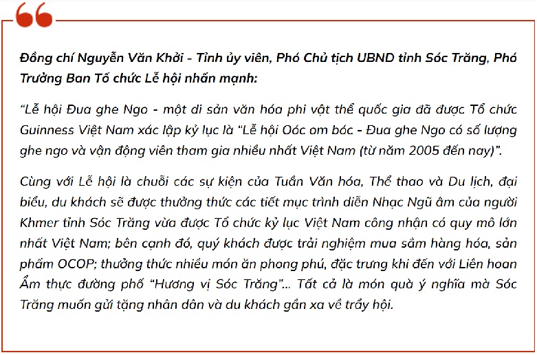 Lễ hội Oóc om bóc - Đua ghe Ngo Sóc Trăng, khu vực đồng bằng sông Cửu Long lần thứ VI và Tuần Văn hóa, Thể thao và Du lịch Sóc Trăng lần thứ I năm 2024 là ngày hội để những đóa hoa mang bản sắc “đoàn kết” ấy được tỏa sáng. Người dân Sóc Trăng rộn rã trong ngày hội, tất cả cùng cất lên những âm thanh ngày mới đến từ cung bậc cảm xúc được hun đúc từ truyền thống để giới thiệu, đón chào, mời gọi du khách thập phương đến với vùng đất Sóc Trăng đậm dấu ấn bản sắc trong Lễ hội Oóc om bóc - Đua ghe Ngo năm 2024.